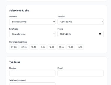 Tus clientes pueden reservar horas directamente via URL pública, sin necesidad de apps extra.